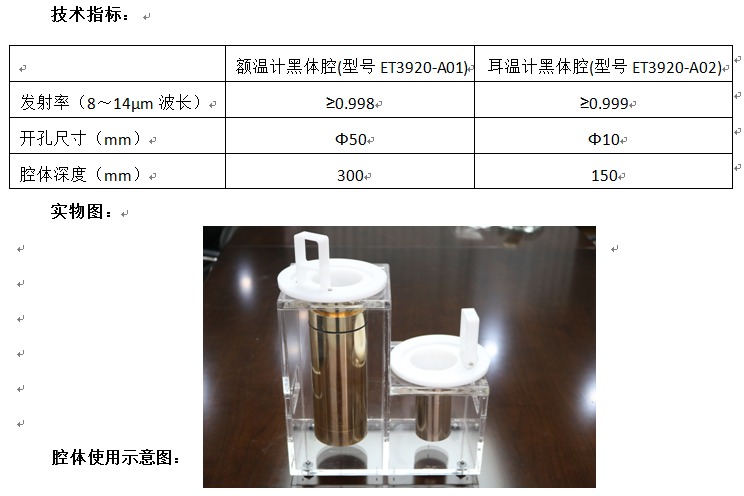我公司生产的黑体辐射腔有两种型号,分别用于校准红外耳温计和红外额温计。黑体腔外部采用镀金工艺,内部制作了发射率高达0.95的黑体涂层,产品符合JJF1107-2003、JJF1164-2019等规范的要求,能够满足绝大部分的红外耳温计与红外额温计的校准需求。